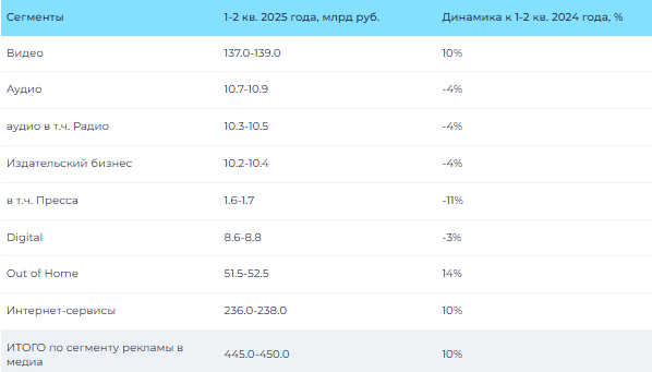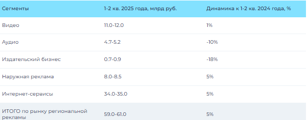 Региональный рекламный рынок в 1-м полугодии 2025 года также находился в положительной зоне. По предварительным оценкам, которые в дальнейшем могут уточняться, по итогам полугодия он вырос на 2%, а его объем (без учета московского рынка) в средствах распространения рекламы по пяти сегментам (Видео, Аудио, Издательский бизнес, Наружная реклама и Интернет-сервисы) вплотную приблизился к 60 млрд руб.
