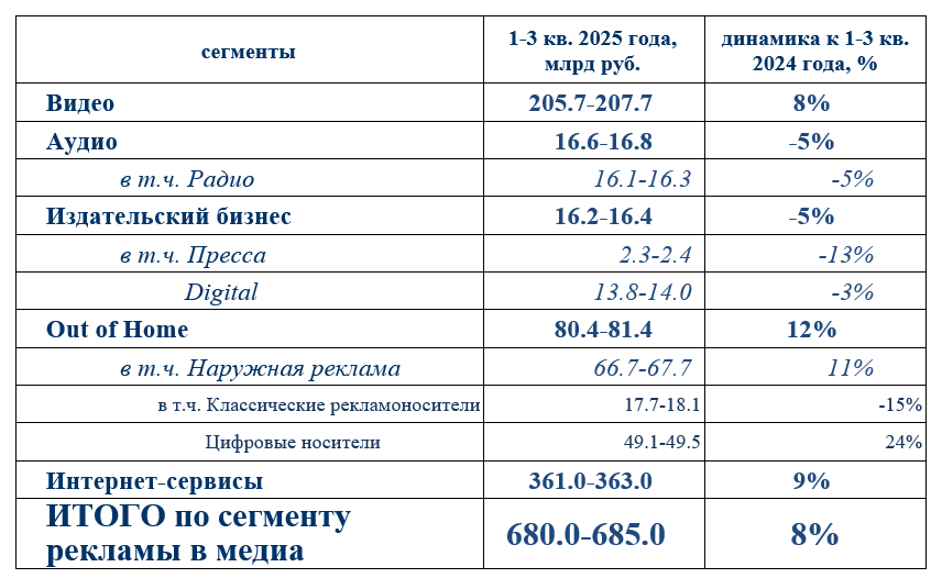 Региональный рекламный рынок в целом в первые три квартала 2025 года также находился в положительной зоне. По итогам девяти месяцев он вырос на 2%, а его объем (без учета московского рынка) в средствах распространения рекламы по пяти сегментам (Видео, Аудио, Издательский бизнес, Наружная реклама и Интернет-сервисы) составил почти 93 млрд руб.