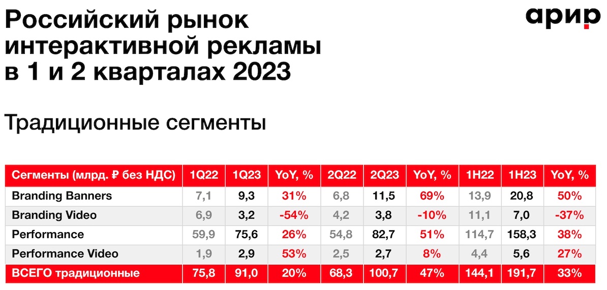 По данным АРИР, объем традиционных сегментов рынка интернет-рекламы в первом полугодии 2023 года составил 191,7 млрд рублей. Это на 33% больше, чем за аналогичный период 2022 года, и на 35% больше, чем в 2021-м. В оценку не вошли инновационные интернет-сегменты — ритейл-медиа, реклама в классифайдах, мессенджерах, инфлюенс-маркетинг и другие. Их объем в ассоциации обещали посчитать по итогам года. Президент АРИР Борис Омельницкий также сообщил ADPASS, что ассоциация не учитывала данные из ЕРИР, который ведет Роскомнадзор.