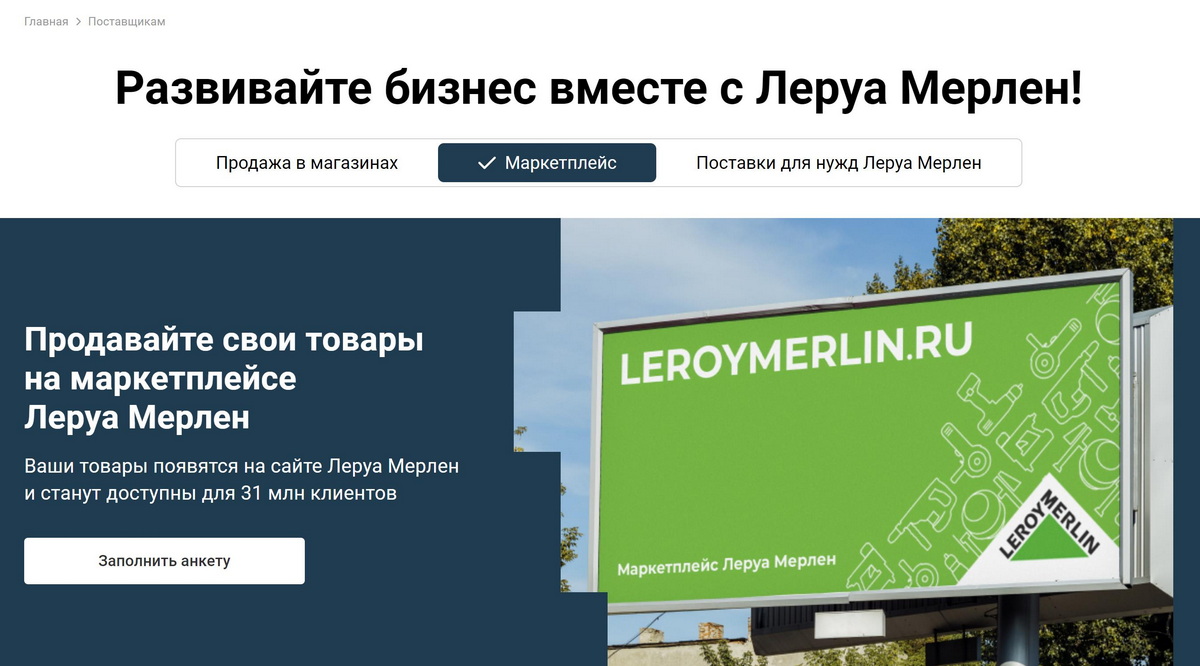 В отличие от OBI другие крупные игроки DIY-рынка предпочитают сами выступать в роли маркетплейсов, предлагая поставщикам и производителям продавать их товары на своих площадках и решая вопросы с хранением и логистикой. Например, самый крупный ритейлер сегмента – Leroy Merlin – прямо называет себя «маркетплейсом» и готов разместить товары сторонних селлеров на полках своего интернет-магазина. Таких товаров на сайте Leroy Merlin очень много. Они помечаются как «товар партнера» и их невозможно купить в офлайн-гипермаркетах сети.