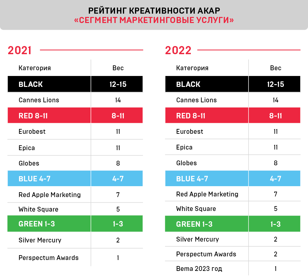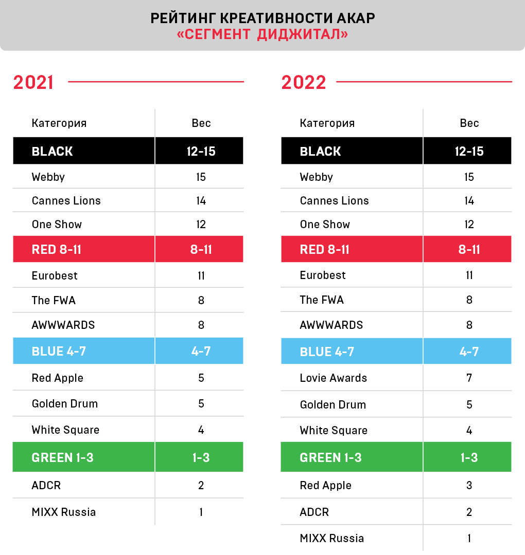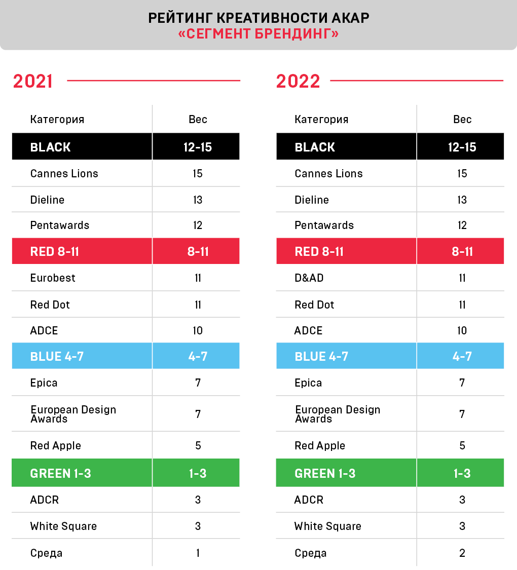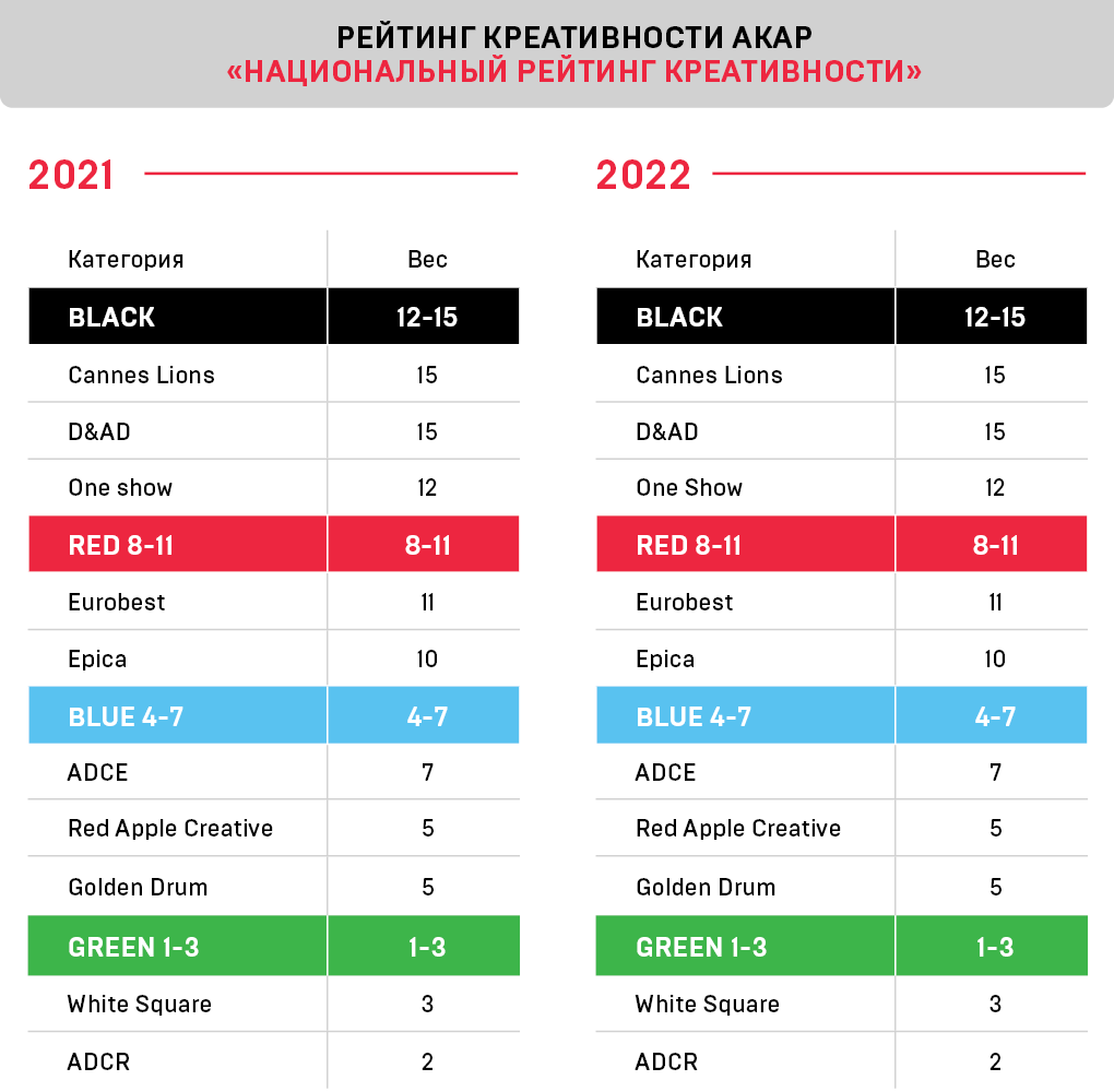 В 2022 году в сегменте Рейтинга креативности «Национальный рейтинг креативности» состав фестивалей и их оценка остались прежними. Так, будет учитываться успешное участие в Cannes Lions и D&DA, за которые агентства смогут получить по 15 баллов. Фестиваль One show может принести агентствам 12 баллов, Eurobest и Epica принесут 11 и 10 баллов соответственно. За успешное участие в ADCE компании могут получить 7 баллов, за Red Apple и Golden Drum можно получить по 5 баллов, а за White Square и ADCR эксперты присудят 3 и 2 балла соответственно.