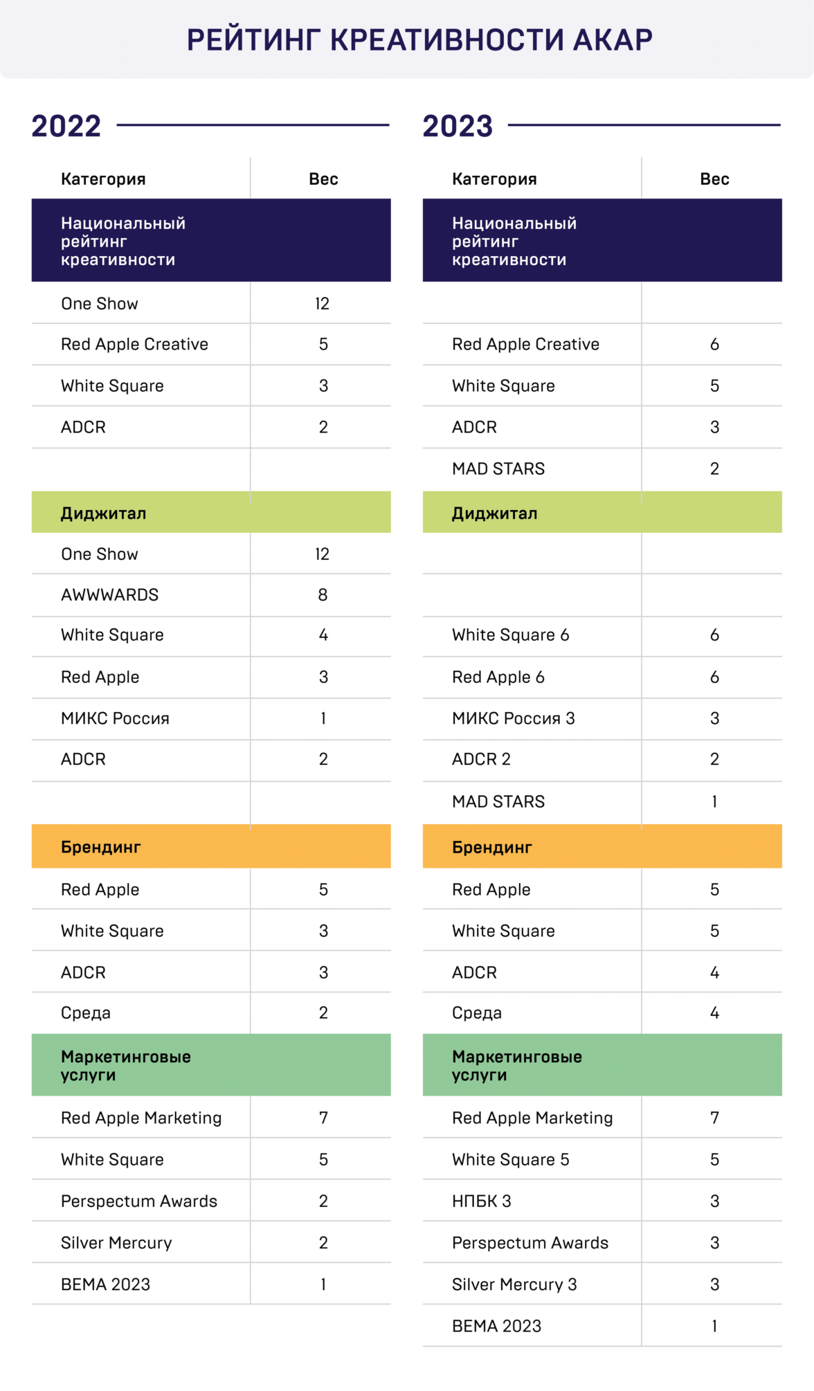 В сегменте «Digital» свои позиции улучшили Red Apple и White Square — они имеют наибольший вес и дают по 6 баллов. За успешное участие в конкурсе «МИКС Россия» теперь можно заработать на 2 балла больше — 3 балла. Награда ADCR будет оцениваться в 2 балла, награда MAD stars — в 1 балл.