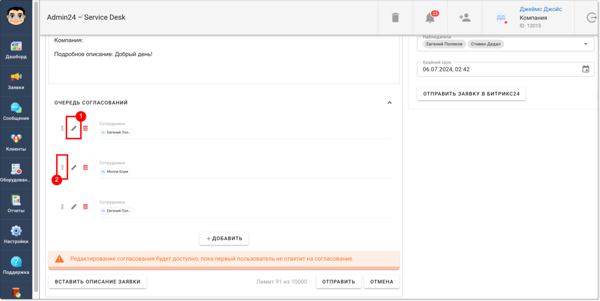 Отметим, что каждый шаг согласования можно редактировать — для этого нужно нажать на иконку карандаша (1) рядом.