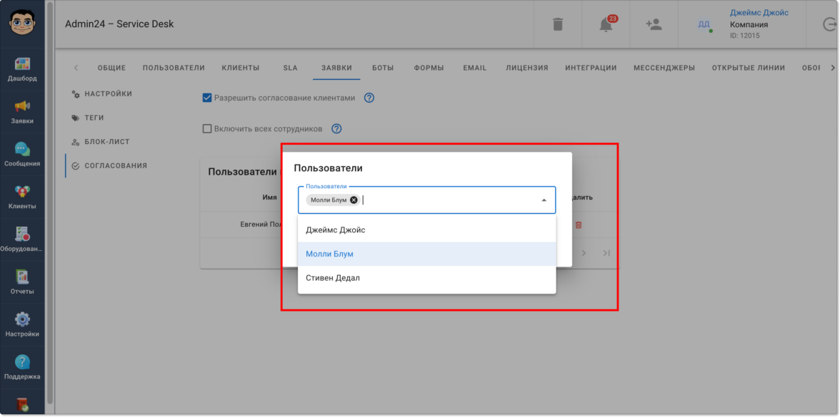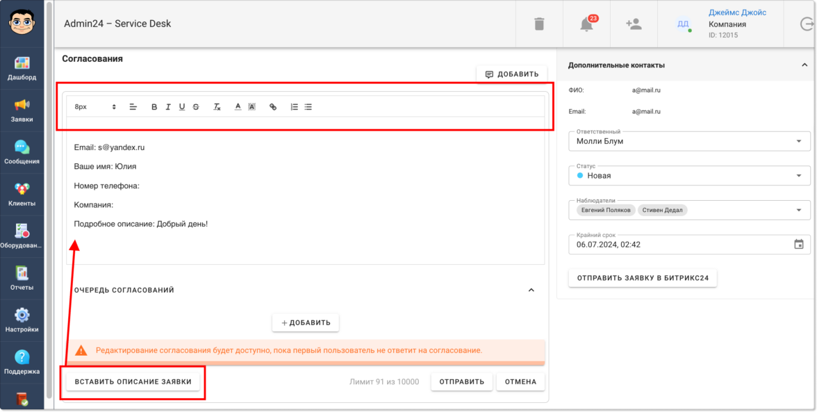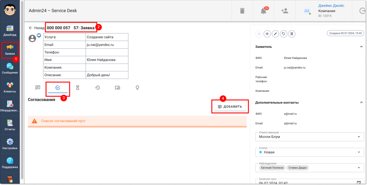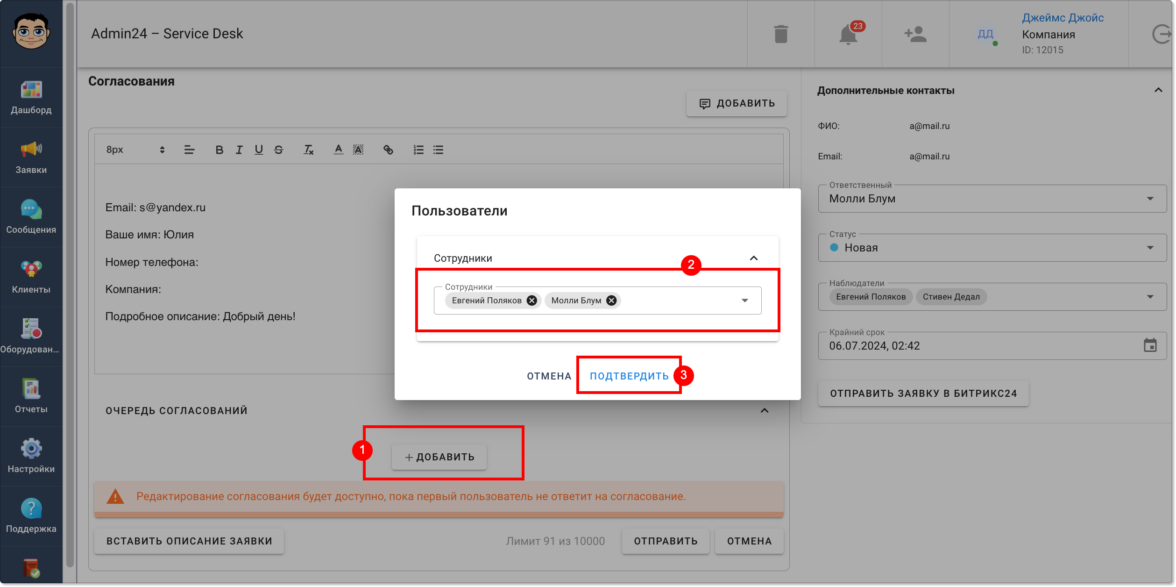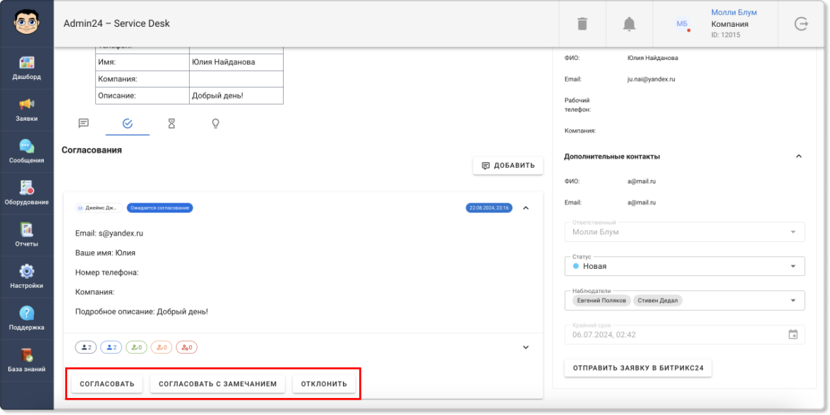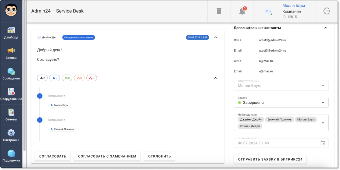 В Admin24 появился функционал, позволяющий согласовывать информацию в заявках. Он доступен всем пользователям по умолчанию и позволит ускорить процесс согласования, который без автоматизации нередко затягивается.