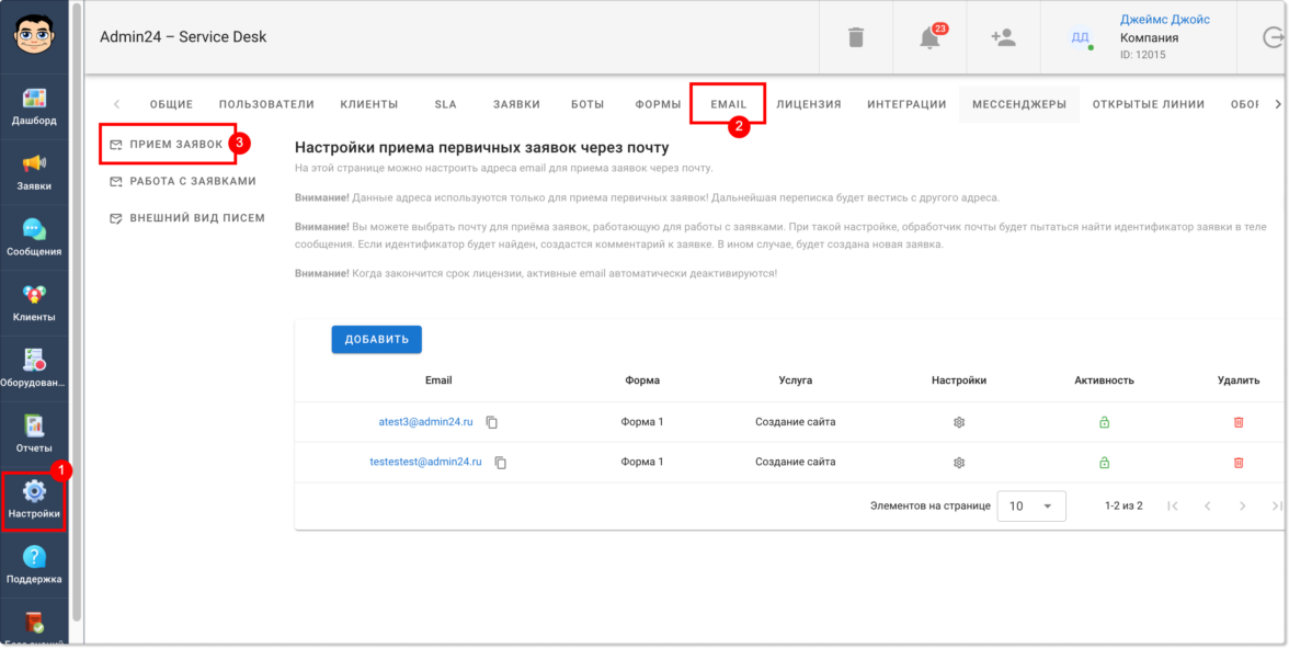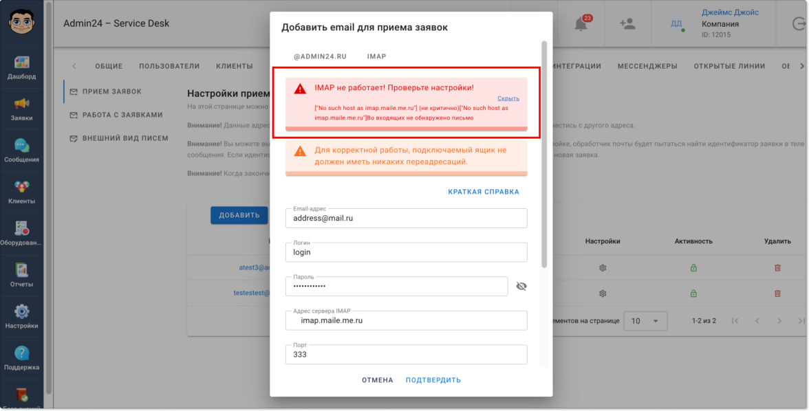 Теперь при подключении почты по IMAP в разделе «Настройки» → EMAIL → «Прием заявок», если какие-либо данные будут введены неверно, высветится уведомление с подробным описанием ошибки. Это поможет быстрее устранить причину и успешно подключить почтовый ящик.