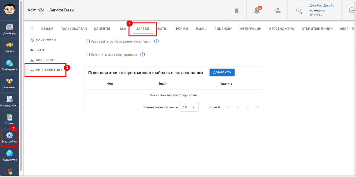 Чтобы настроить возможность согласования в заявках, перейдите в раздел «Настройки» → «Заявки», и далее — во вкладку «Согласования».