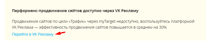 Вот такое сообщение показывается в myTarget при выборе конверсионной цели «Трафик»:
