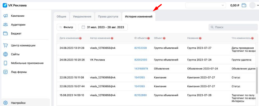 В кабинете VK Рекламы появился раздел «История изменений». В нем можно отслеживать все изменения, которые вносились в кампанию с момента ее запуска. Например, здесь можно посмотреть, как менялись таргетинги, какие объявления удаляли и как менялся статус кампании.