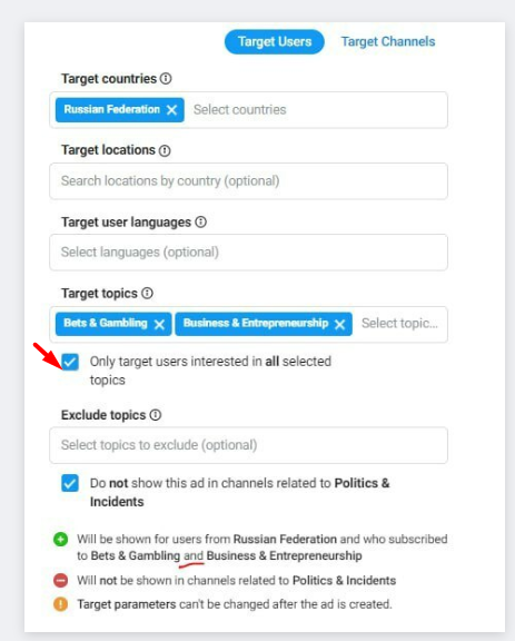 Target Topics — показ рекламного объявления настраивается с учетом интересов целевой аудитории. Пользователь увидит рекламу, если уже подписан на несколько каналов соответствующей тематики.