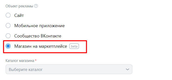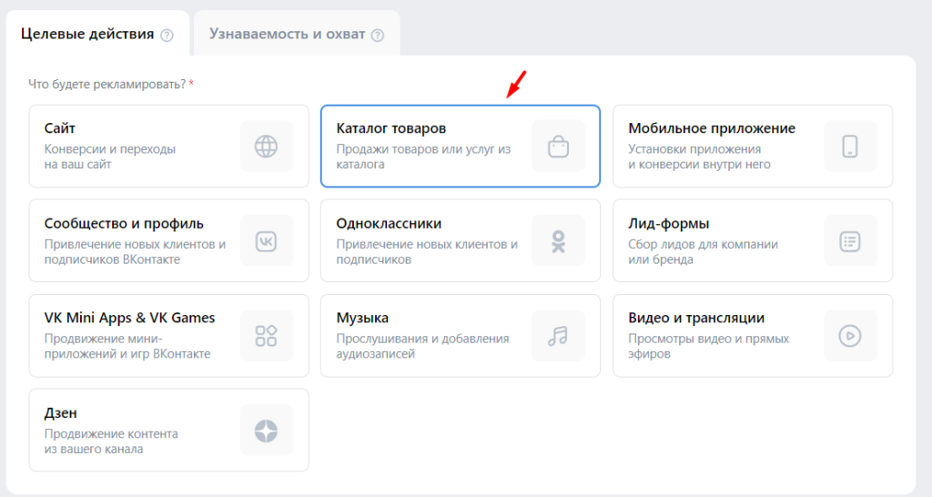 Для запуска кампании в рекламном кабинете VK Рекламы надо выбрать «Каталог товаров»: