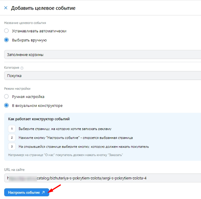 в разделе «Название целевого события» выбрать «Выбирать вручную»;