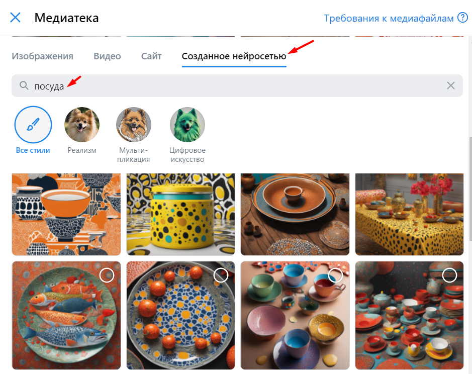 В медиатеке выбрать вкладку «Созданное нейросетью» и в строке поиска указать тематику креатива: