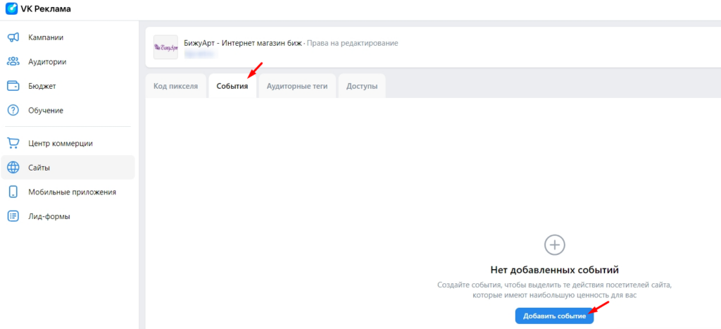 После клика по кнопке «Настроить событие» открывается выбранная страница. На ней нужно выбрать кнопку, которую может нажать пользователь.