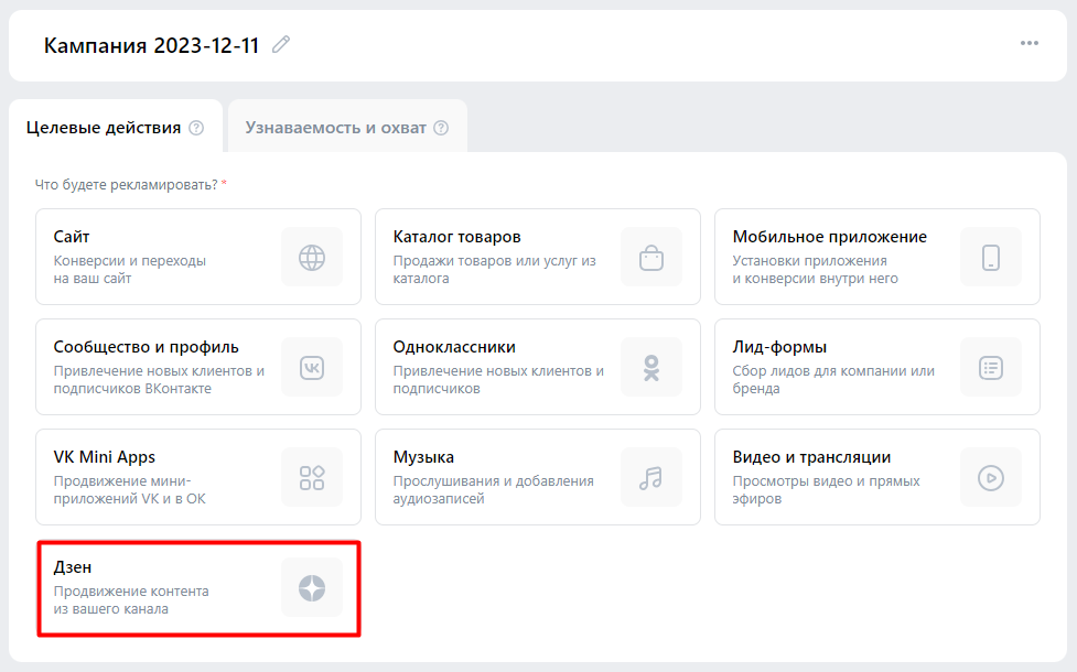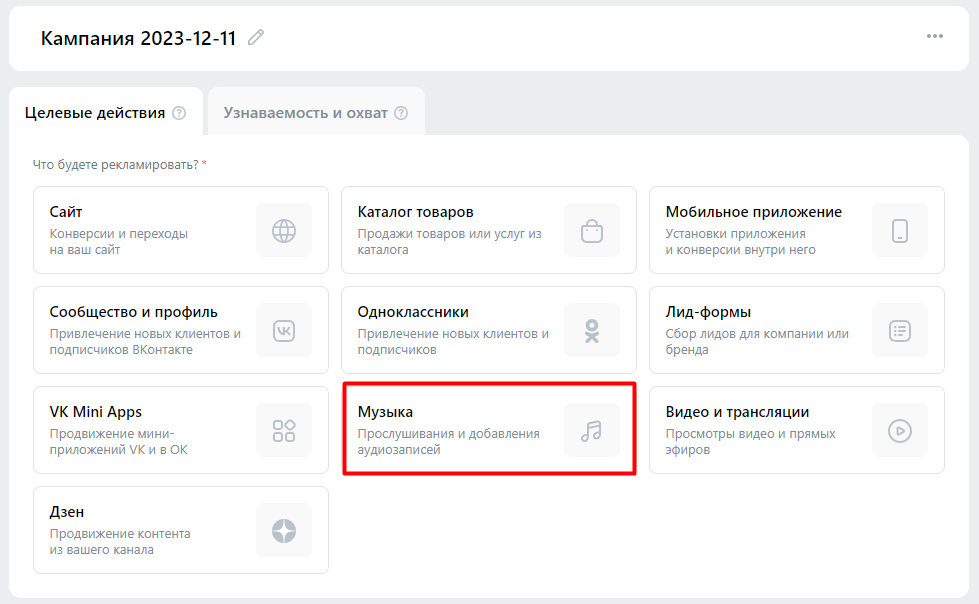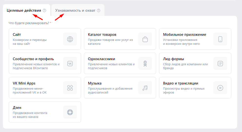 Также расширился список доступных целевых действий — появилась возможность продвигать сообщество и профиль ВК, мини-приложения VK и ОК, статьи в Дзене, профиль в Одноклассниках, музыку, видео и трансляции.