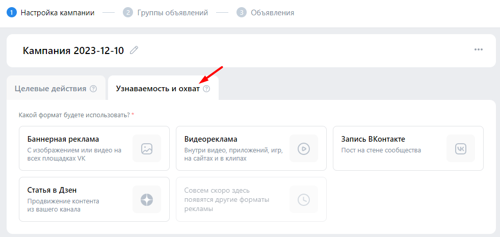 Интерфейс кабинета VK Рекламы постоянно меняется из-за активного развития площадки. В 2023 году сюда не только переносили цели из ВКонтакте и myTarget, но и добавляли новые инструменты. Например, появился инструмент «Узнаваемость и охват», описанный выше. Как результат, интерфейс настройки новой кампании значительно изменился.