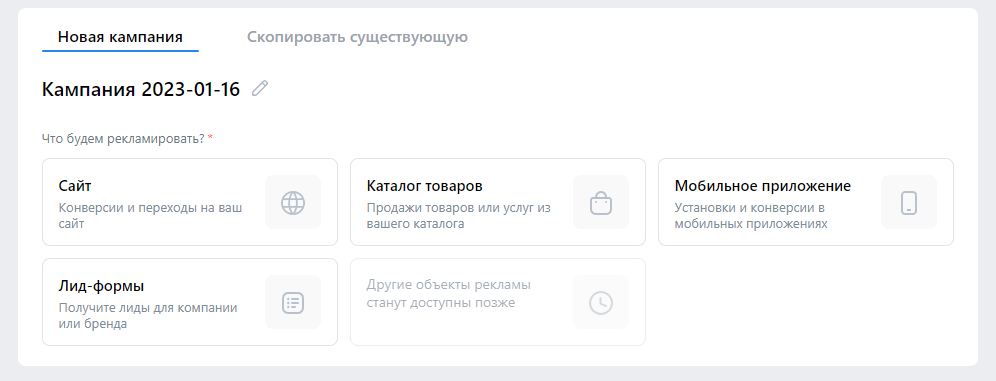 То есть для запуска новой кампании можно было выбрать только объект рекламирования — сайт, лид-формы, каталог товаров или мобильное приложение.