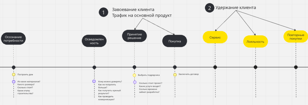 Продолжаем пример с архитектурным бюро. Давайте посмотрим, какой шаг клиента предшествует этапу выбора подрядчика на проект? Гипотеза может выглядеть так: «Наши клиенты — это мужчины с высоким доходом, они хотят построить дом, который будет оптимально отвечать потребностям семьи, но чувствуют себя неуверенно, поскольку пока не разобрались в особенностях частной застройки и боятся, что не смогут правильно поставить задачу архитектурному бюро, заплатят за работу и получат неподходящий результат. Мы можем предложить им инструмент в качестве решения проблемы. Давайте подготовим обучающий курс о том, как просчитать полную стоимость владения домом из разных материалов, что важно учесть при проведении коммуникаций, по каким параметрам выбирать подрядчиков для стройки, секреты юридического оформления собственности и другие подводные камни. Таким образом мы сможем завоевать внимание и лояльность клиента раньше, чем это сделают конкуренты».