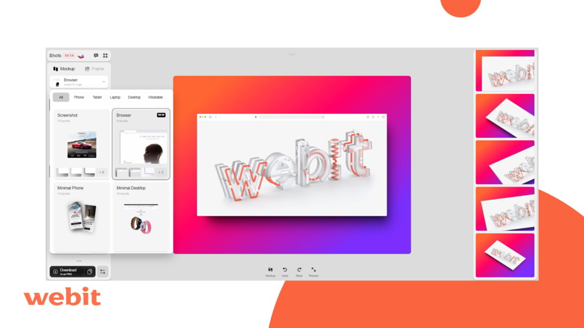 Shots.so предлагает шаблоны для различных устройств, что позволяет оценить, как ваш макет будет выглядеть на разных экранах. В сервисе есть макеты продуктов Apple, а если вам нужно просто разместить изображение на красивом фоне без использования макетов устройств, вы можете выбрать режим скриншота или рабочего стола.