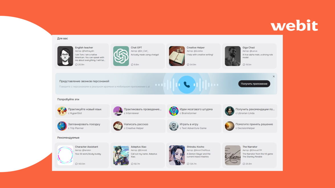 Этот сервис бесплатный и поддерживает общение на русском языке. Но перевод выглядит довольно механическим. Character.ai позволяет не только читать, но и прослушивать диалоги, созданные нейросетью.