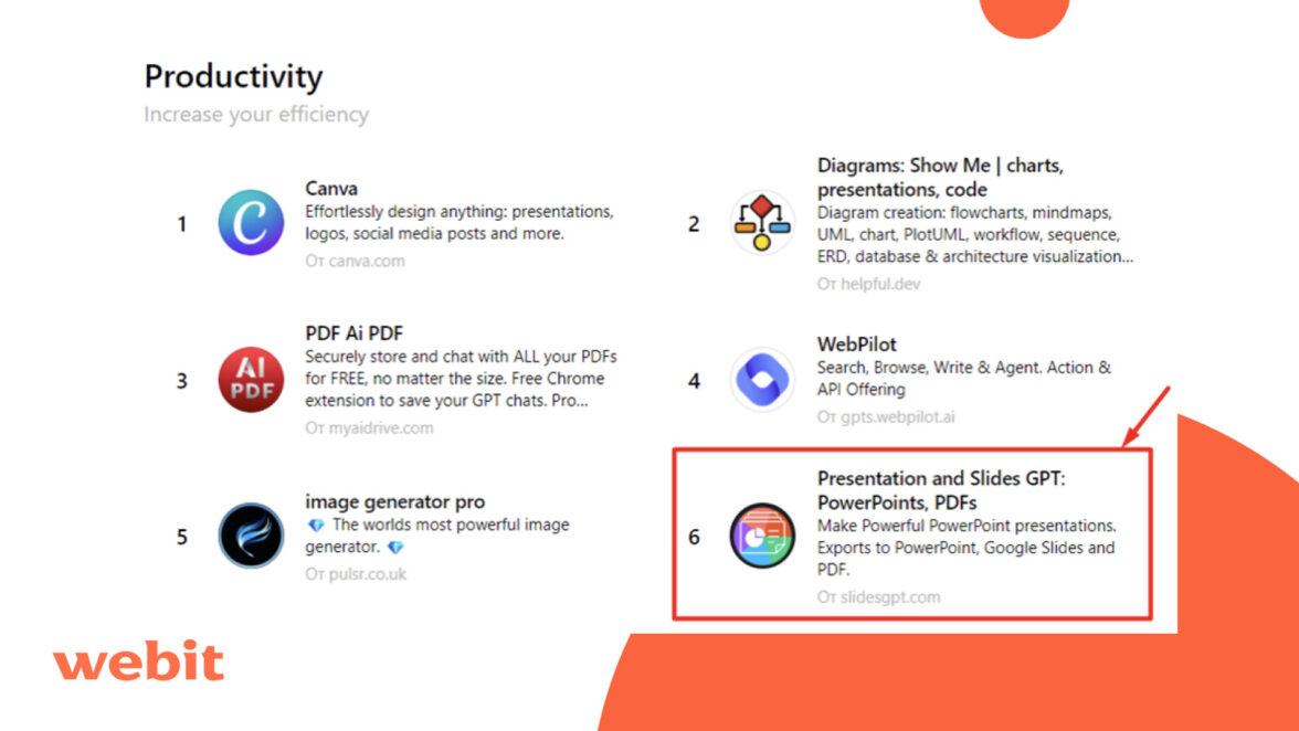 3. Presentation and Slides GPT: PowerPoints, PDFs — помогает создавать презентации. Правда изображения подбираются с фотостока, но их можно заменить на свои при необходимости. После генерации есть возможность скачать презентацию в формате Power Point, Google Slides, pdf.