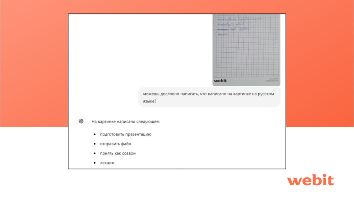 2. Chat GPT может расшифровывать текст на изображении. Даже рукописный. Даже на русском языке.
