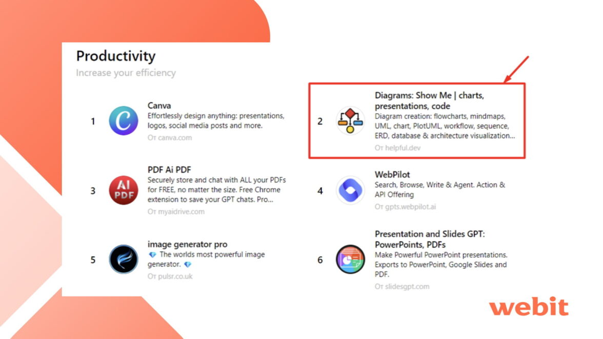 2. Diagrams: Show Me | charts, presentations, code и Whimsical Diagrams — два плагина, которые создают Mindmap и графики. Для построения нужно задать тему, либо прислать свои данные.