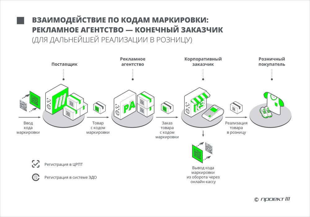 В классической цепочке «поставщик — агентство — корпоративный заказчик» маркированная продукция передается агентству от поставщика, а далее агентство гасит коды в электронной системе при передаче заказчику. Важно помнить, что погашенный код означает вывод товара из оборота, и товар не подлежит дальнейшей продаже. Однако код все равно остается закреплен за единицей товара и может быть проверен контролирующими органами.