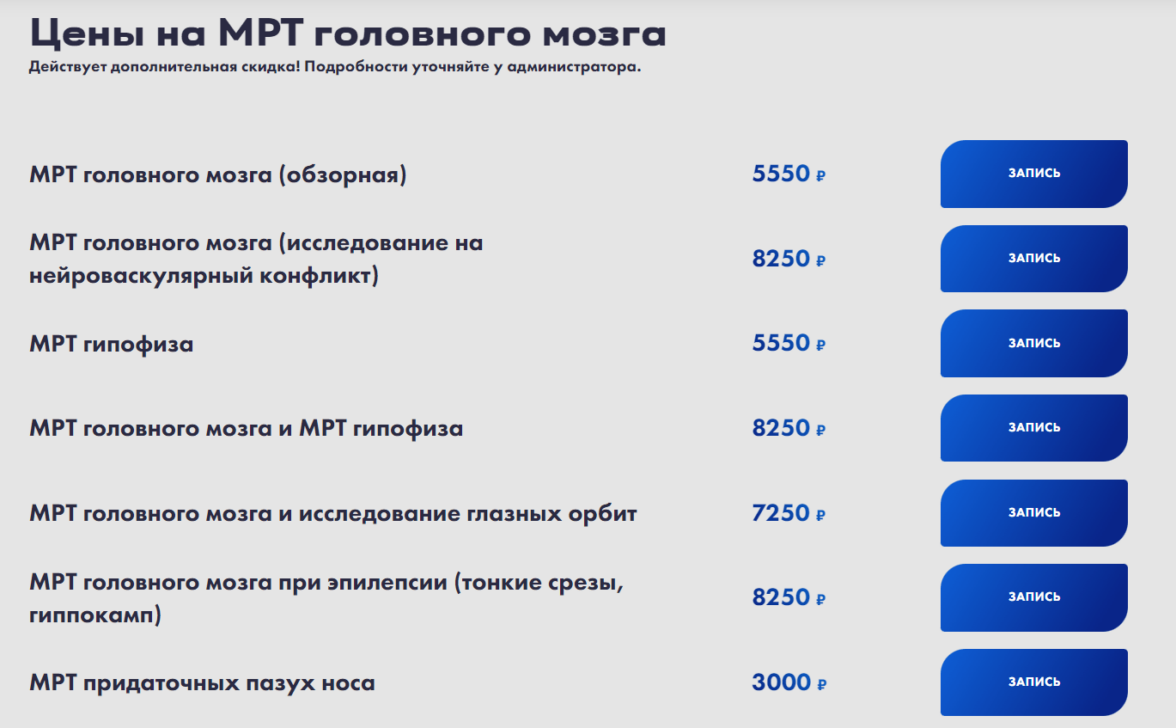 В тематике МРТ диагностики для раскрытия интента и конверсионности страниц, в шаблон всех услуг настоятельно рекомендуется включить следующие блоки: