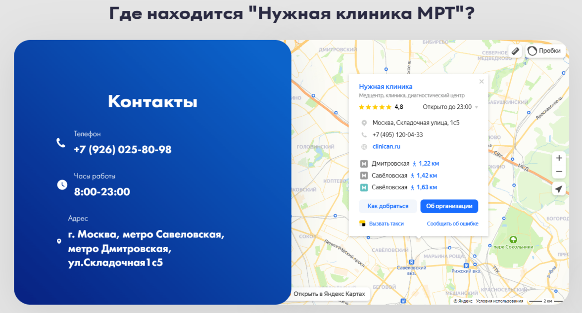 Также для всех клиник и центров очень важным является блок с контактной информацией, так как для получения услуги клиент должен прийти в клинику.