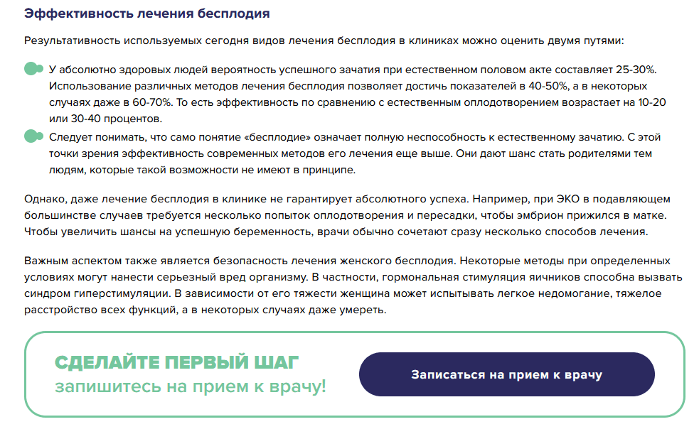 Возьмем услугу — лечение бесплодия у женщин. Здесь выдача преимущественно информационная (80 на 20%), следовательно требуется больше текстового контента и раскрыть больше интентов.