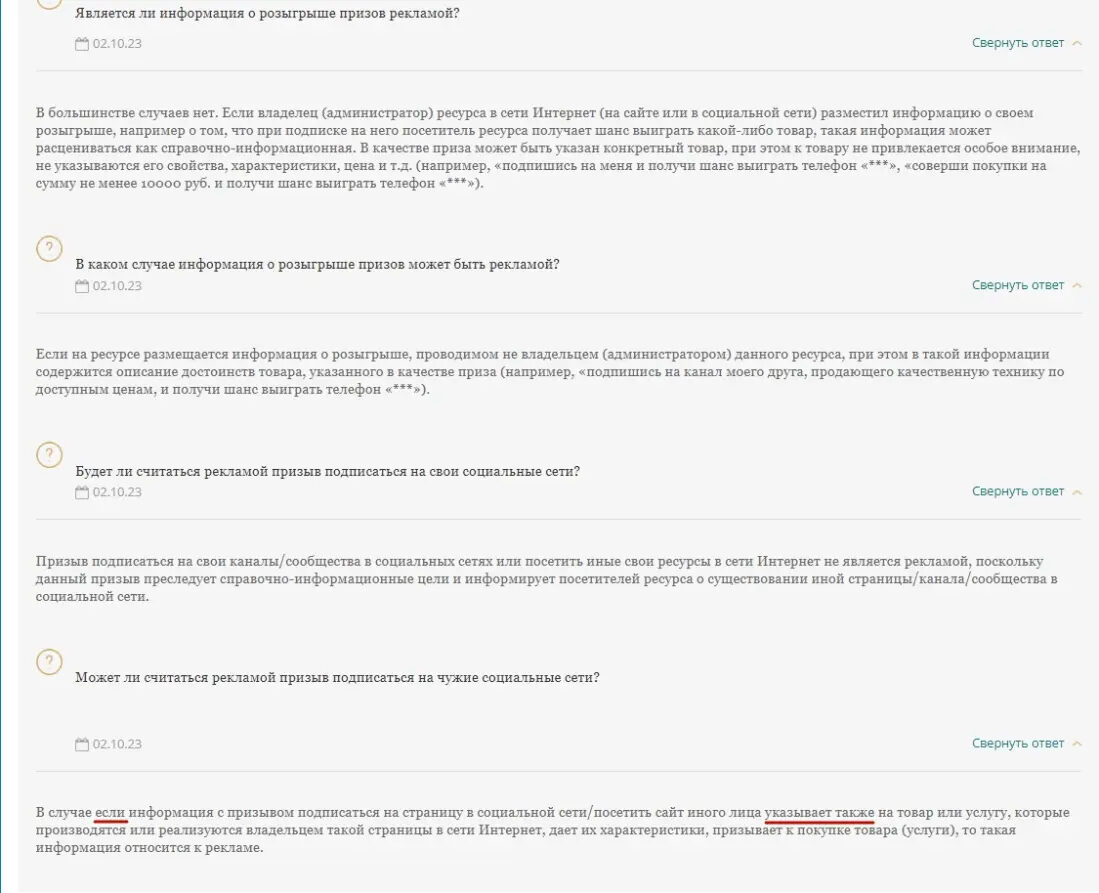 Важная тема про розыгрыши. По ним всегда было очень много вопросов. Теперь все стало гораздо проще после пояснения ФАС. Естественно посты с розыгрышами не должны быть закреплены, иначе ФАС с большой вероятностью признает пост с розыгрышем рекламным материалом, что подтверждает новосибирский кейс.