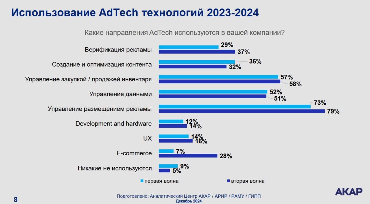 Самым востребованными рекламными технологиями в 2024 году являются инструменты управления размещением рекламы. Их используют 79% участников исследования — доля выросла на 6 п.п. с первой волны.