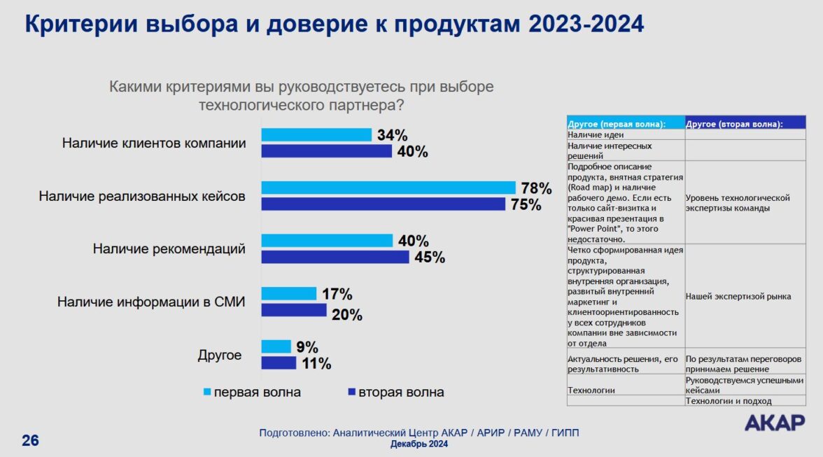 При выборе технологического партнера 75% представителей индустрии смотрят на примеры реализованных проектов. Вторым по популярности критерием отбора являются рекомендации (45%). Опыт партнера в работе с клиентами важен для 40% игроков, а 20% участников исследования изучают информацию об организации в СМИ, прежде чем принять решение о сотрудничестве.
