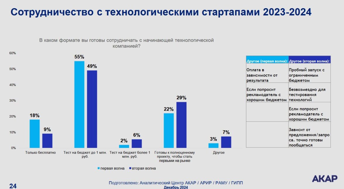 Среди форматов, которые респонденты чаще других выбирают для сотрудничества со стартапами, 49% опрошенных назвали тестовые проекты с небольшими бюджетами до 1 млн рублей. К реализации полноценных проектов, в перспективе позволяющих стать первыми на рынке, готовы 29% компаний, еще 9% предпочитают бесплатное сотрудничество.