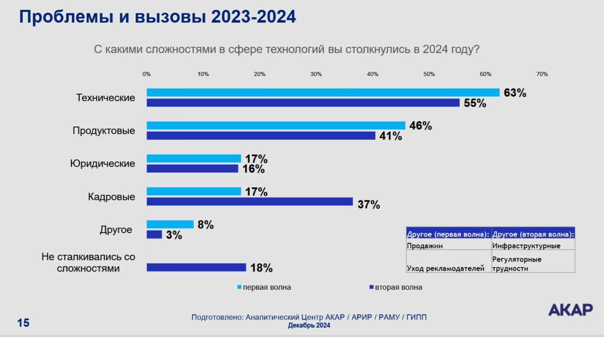 Главной проблемой рынка рекламных технологий больше трети (37%) участников исследования назвали кадровый голод. Доля тех, кто считает эту проблему одной из основных, увеличилась на 20 п.п. за год. Респонденты считают, что индустрии не хватает не только квалифицированных специалистов, но и молодых сотрудников без опыта работы.