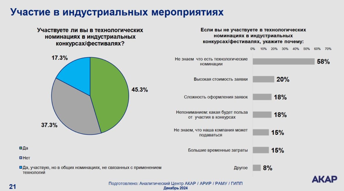 Участие в фестивалях помогает компаниям строить репутацию и привлекать новых специалистов. В технологических номинациях профильных конкурсов пробуют свои силы 45% игроков рынка. Не принимают участие в индустриальных фестивалях 37% опрошенных. Основная причина — отсутствие знания о существовании технологических номинаций, об этом сообщили 58% респондентов. Других участников исследования останавливают высокая стоимость (20%), сложность оформления заявок (18%) и непонимание пользы от участия в конкурсах (18%).