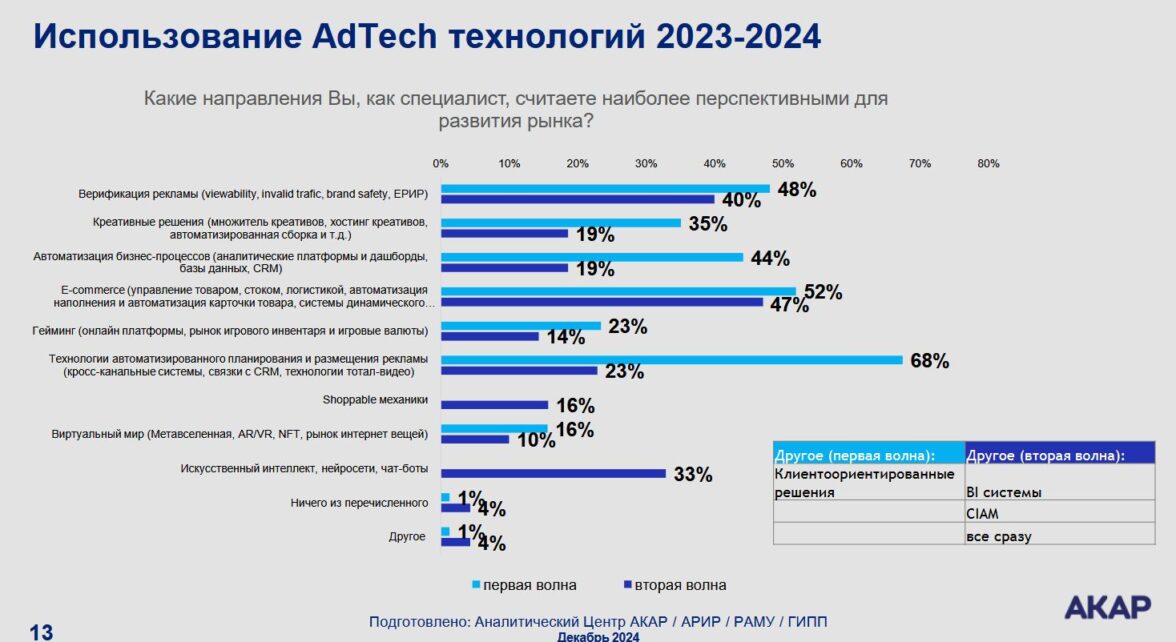 Треть участников опроса (33%) выделила среди ключевых направлений ИИ, нейросети и чат-боты. В предыдущую волну опроса никто из респондентов еще не назвали данное направление в числе перспективных. Год назад большая часть респондентов (68%) считали перспективными технологии автоматизированного планирования и размещения рекламы. О том, что быстрее других сегментов будет развиваться автоматизация бизнес-процессов тогда заявляли 44% опрошенных. Сейчас вес этих показатели сократился до 23% и 19%, соответственно.