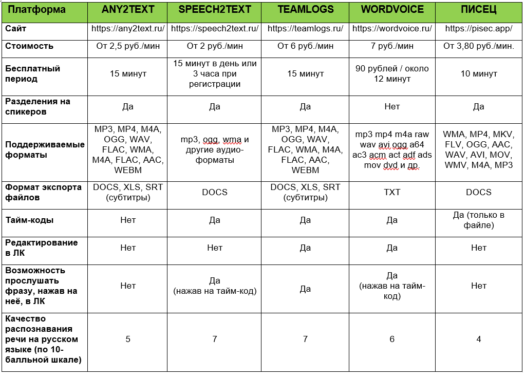 Рассматриваемые платформы оценивались по нескольким критериям: стоимости расшифровки, качеству распознавания речи, возможности разделения на спикеров, возможности редактирования текста в личном кабинете, наличия тайм-кодов, форматам импорта и экспорта файлов и др. Подробная таблица представлена ниже.