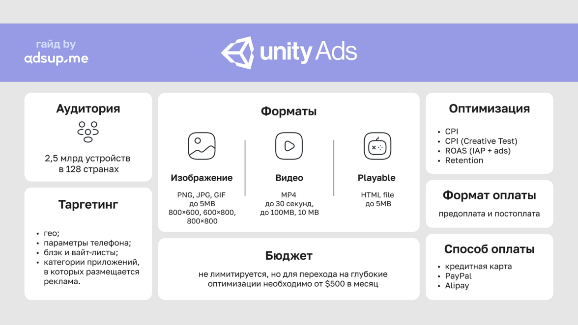 Unity Ads — это рекламная сеть от разработчиков игрового движка Unity, на котором построено около 30% мобильных игр. Как следствие, сеть владеет огромной базой данных о пользователях, что делает ее одним из основных источников для продвижения как игровых, так и неигровых приложений.