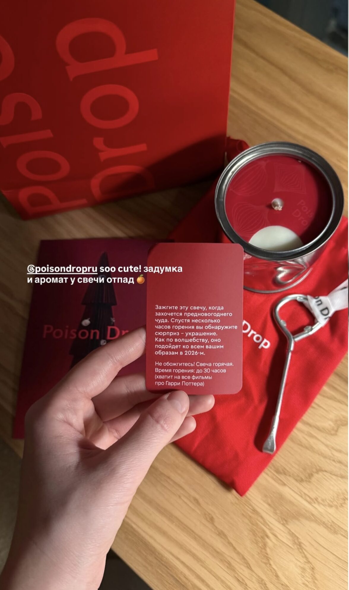 Ювелирный бренд Poison Drop сделал ставку на магию ожидания: свеча с инструкцией «Зажгите, когда захочется предновогоднего чуда». Через несколько часов горения внутри обнаруживалось украшение, которое «подойдет ко всем образам в 2026 году». Даже ремарка о времени горения — «хватит на все фильмы про Гарри Поттера» — работала на вовлечение и storytelling.