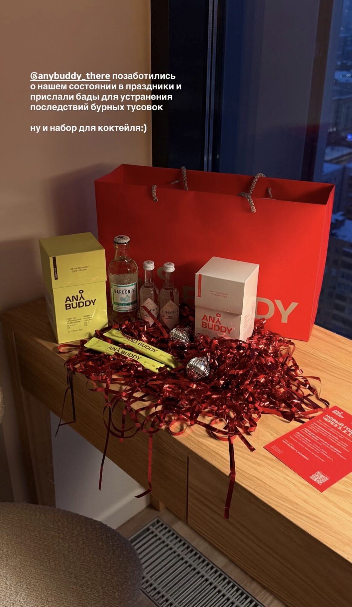Креативный подход показал и health-сегмент. Any Buddy подошли к праздникам с заботой о реальном состоянии аудитории, отправив БАДы для восстановления после бурных вечеринок и набор для коктейлей.
