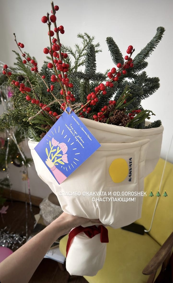 KAKVATA, бренд пуховиков ручной работы, отправил новогодние букеты, «укутанные» в пуховики. Один визуальный жест, и продукт объяснен без слов.