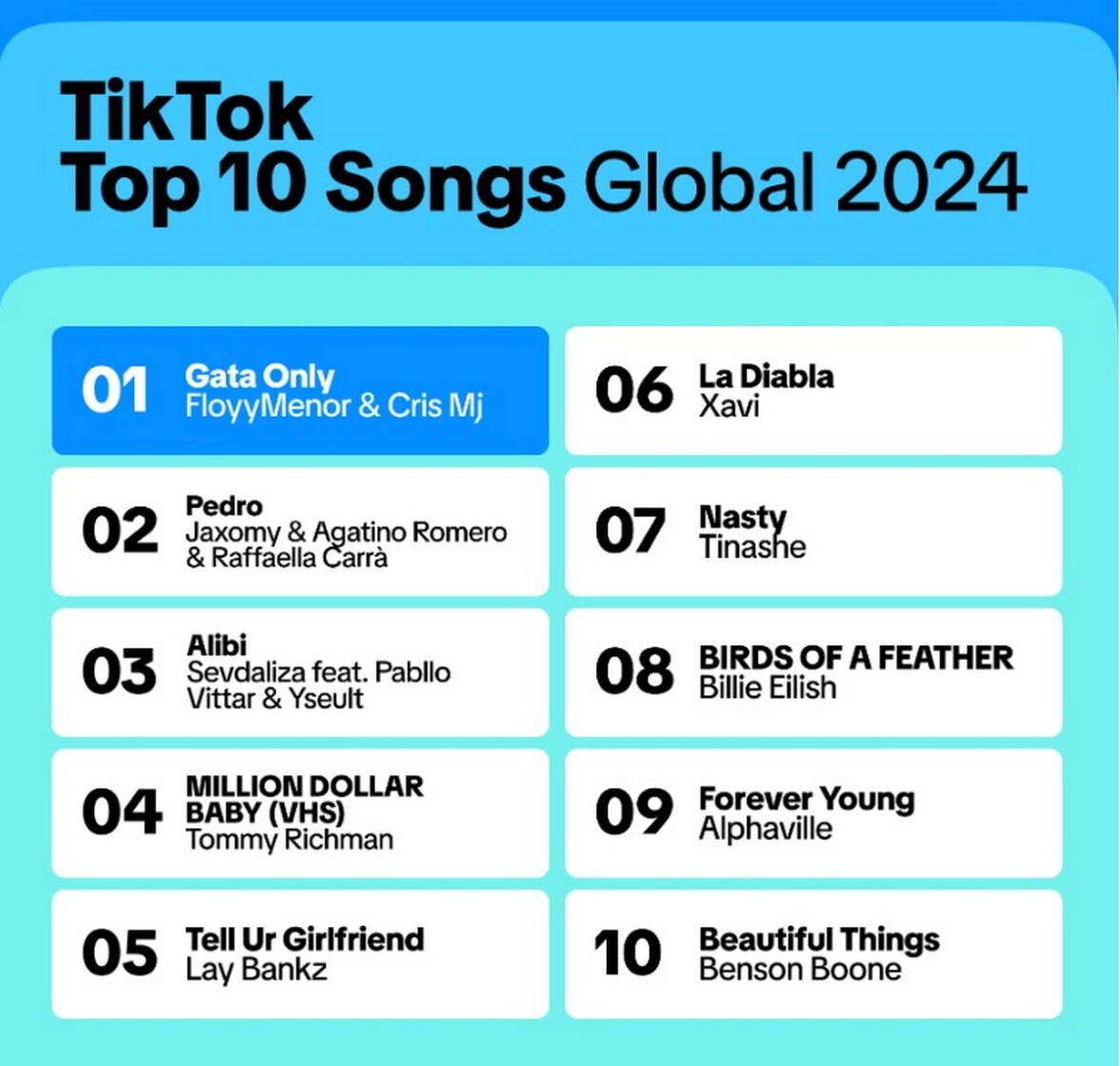 Самых популярных исполнителей определяли по числу просмотров их аккаунтов. А рейтинг самых популярных песен составлялся по другому принципу — по количеству созданных на их основе видеороликов. Cамой популярной песней в общемировом масштабе стала Gata Only в исполнении чилийского дуэта FloyyMenor и Chris MJ. На втором месте песня Pedro (исполнители — Агатино Ромеро, Jaxomy и Рафаэлла Карра). На третьем — Alibi в исполнении Севдализы, Паблло Виттара и Yseult.