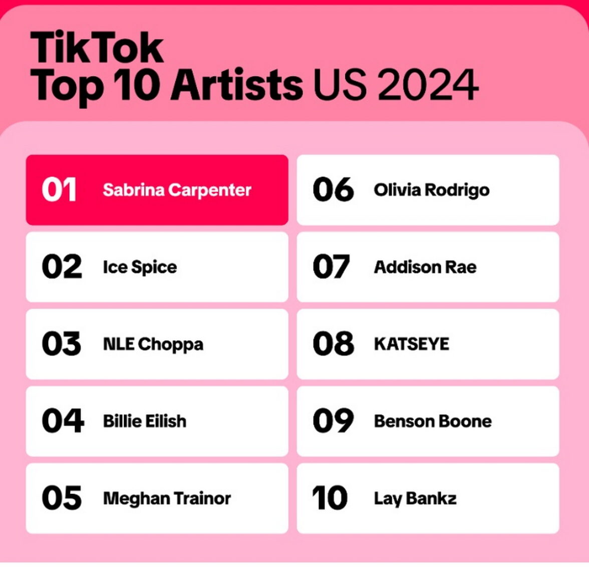 Лишь на десятом месте в общемировом списке Сабрина Карпентер. Для американских тиктокеров она первая. Второе место в американском рейтинге у Ice Spice, третье — у NLE Choppa.