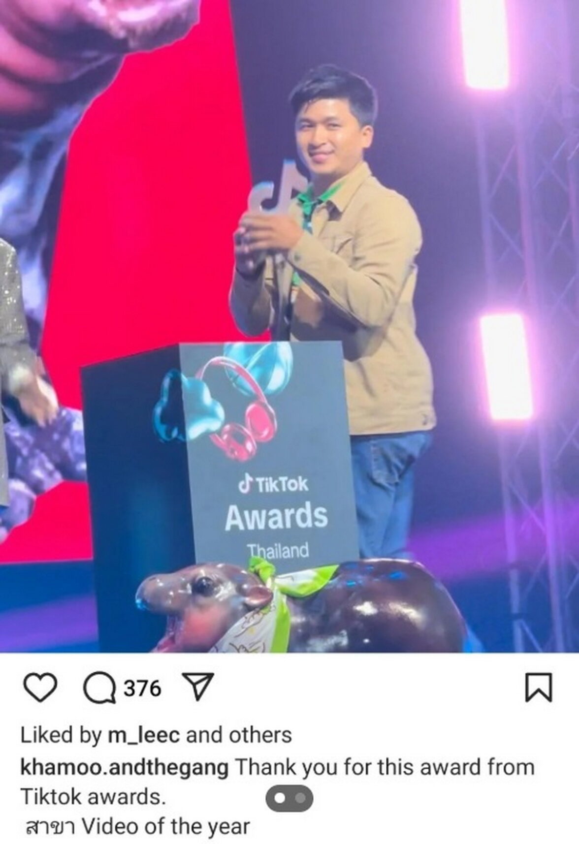 Из числа братьев наших меньших, имеющих аккаунт в TikTok, наибольшей популярности добилась карликовая бегемотиха Му Денг из Таиланда. В ноябре тайское отделение TikTok вручила е высокую награду — TikTok Award — в номинации «видео года».