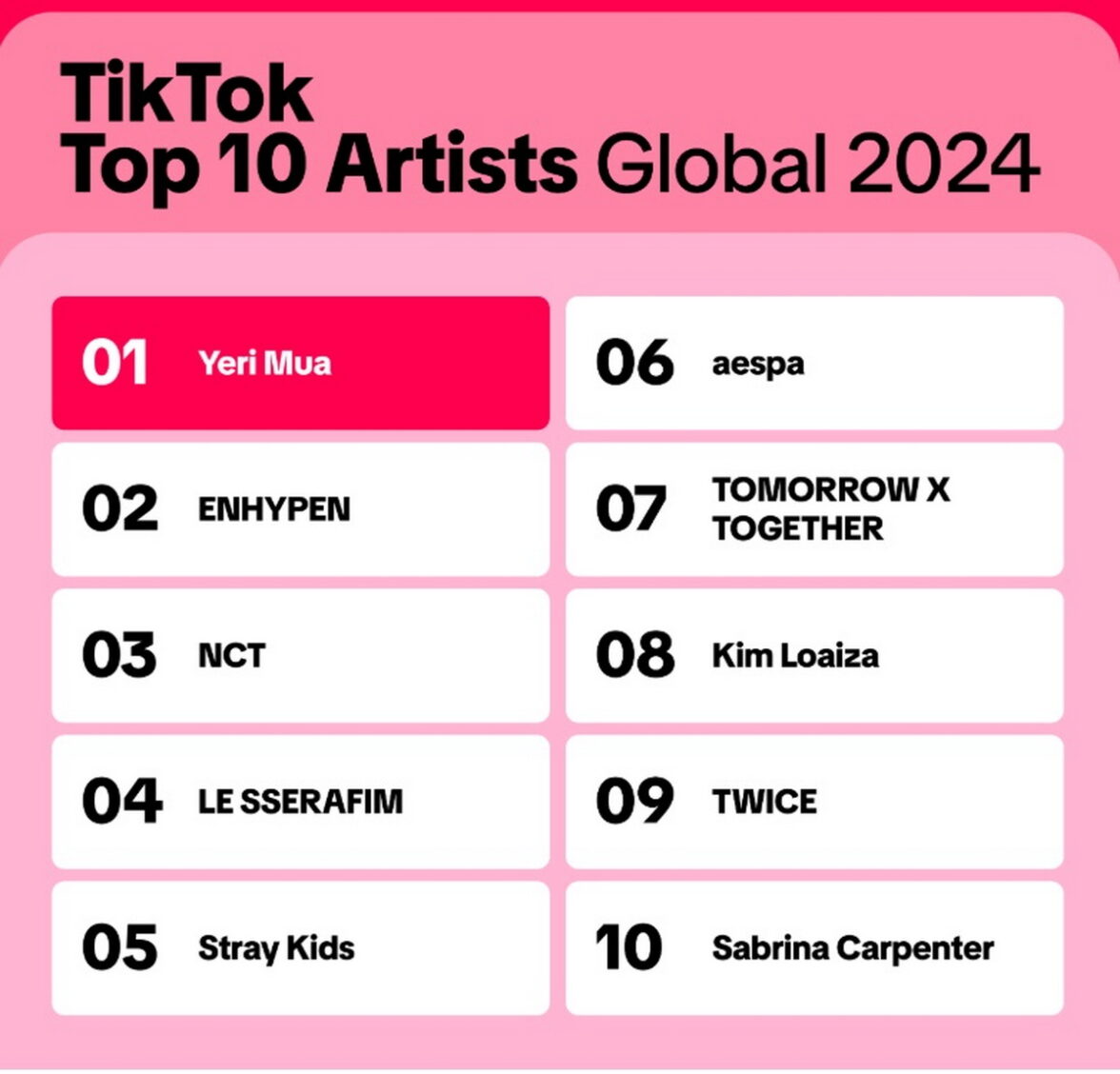 Исполнительницей года в мировом масштабе признана мексиканка Йери Муа, начинавшая свою тик-ток-карьеру с уроков макияжа, а потом решившая запеть. На втором месте в рейтинге исполнителей года — южнокорейская мальчиковая группа Enhypen. На третьем — NCT (отличить ее от Enhypen могут только фанаты К-попа).