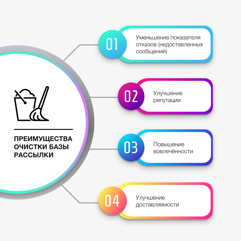 Поэтому очистка базы улучшает результаты кампаний, а также приносит выгоду рассыльщику и адресатам.