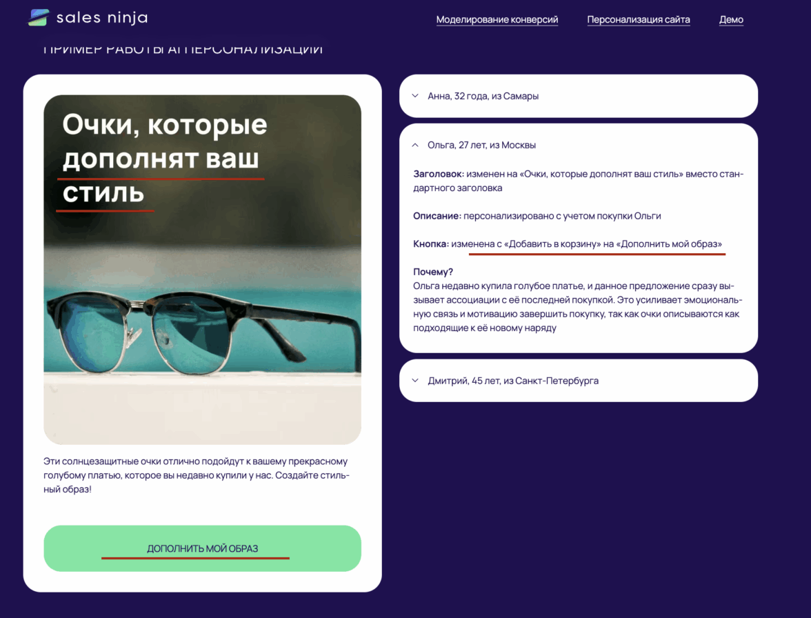Когда мы говорим о сайте, речь уже идет не об олдскульных SEO-улучшениях, а о применении современных подходов к пользовательскому опыту. Инструменты на основе ИИ, например, Sales Ninja, дают нам возможность персонализировать сайт с учетом особенностей поведения пользователей и их предпочтений. Как? С помощью ИИ-алгоритмов сервис моделирует конверсии и оптимизирует по ним креативы.