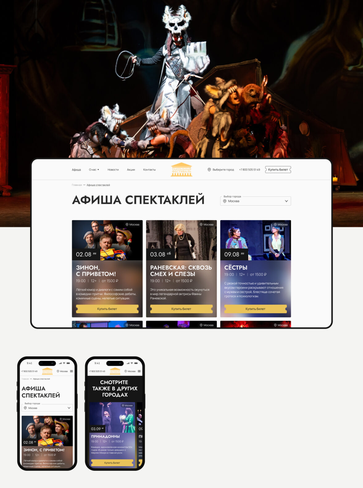 Эта история о том, как мы помогли превратить сайт в полноценную цифровую афишу. Всё: от карточек до билетов адаптировано под мобильные устройства. Сайт одинаково удобен и на телефоне, и на компьютере. Зритель легко находит нужный спектакль, планирует визит и уже на сайте получает то самое театральное настроение – ещё до того, как прозвенит первый звонок в зале.
