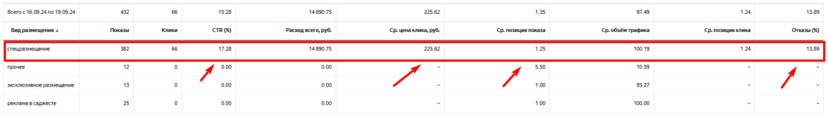 80% показов с Поиска было в спецразмещении на 1–2 местах. CTR очень хороший 17%. Средняя цена за клика вышла 225 рублей. Процент отказов маленький — 14% (обычно оптимальным считается 20%).